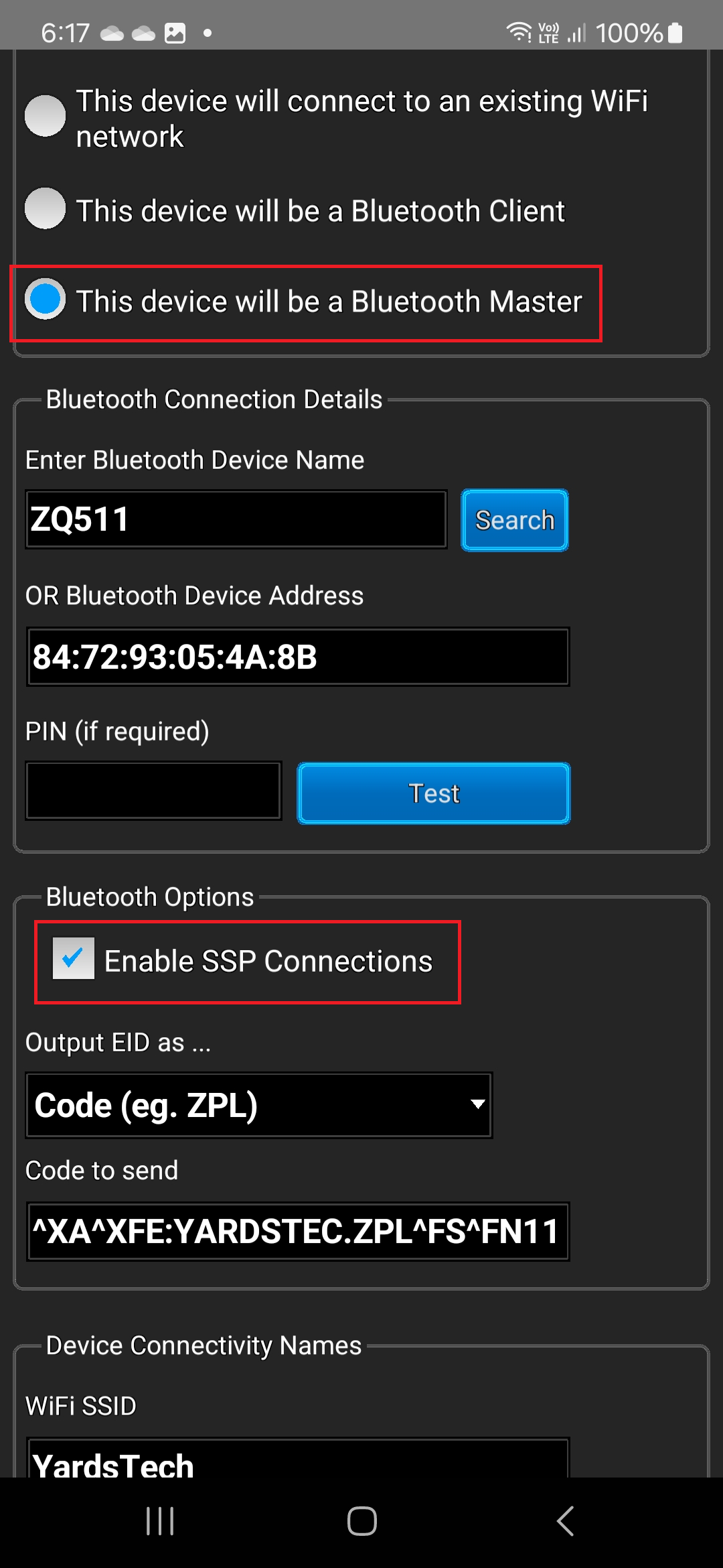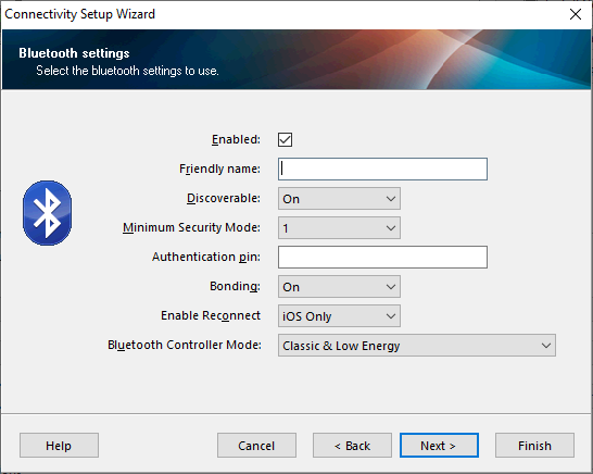 - Using the Zebra Setup Utilities configure the printers Bluetooth as shown below.