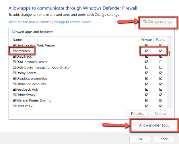 10. Find both "devdisco" and 'Live!" in the list of apps and make sure they are ticked on the left hand column and both Private and Public are ticked. You will need to select "Change settings" to change any settings. If either or both devdisco or Live! are not in the list, select the "Allow another app ..." button and navigate to "C:\Program Files (x86)\PracSys\Stockbook\Programs" (default location) and find "DevDisco" and "LiveEntry" and add them both. Hit OK when done.