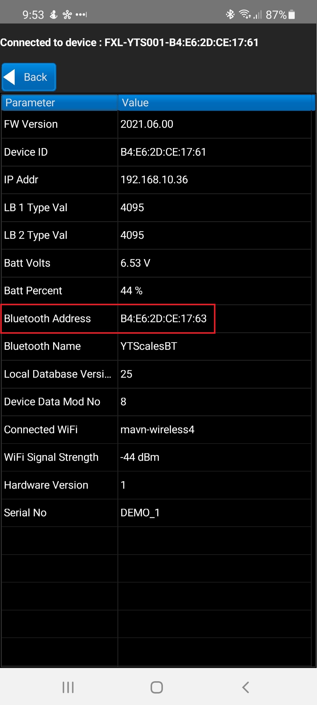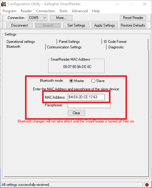 If your reader asks for the Bluetooth/MAC address, it can be obtained in the Devices area on YardsTech® app. Keep in mind that the Device ID is different to the Blueetooth Address, so don't use the wrong one. Also note that the YardsTech® Scales do not require a pass code/pass phrase/pin for Bluetooth connection. Here is an example of where the Bluetooth Address is in the YardsTech® app and how the Gallagher BR reader is configured to be master ...